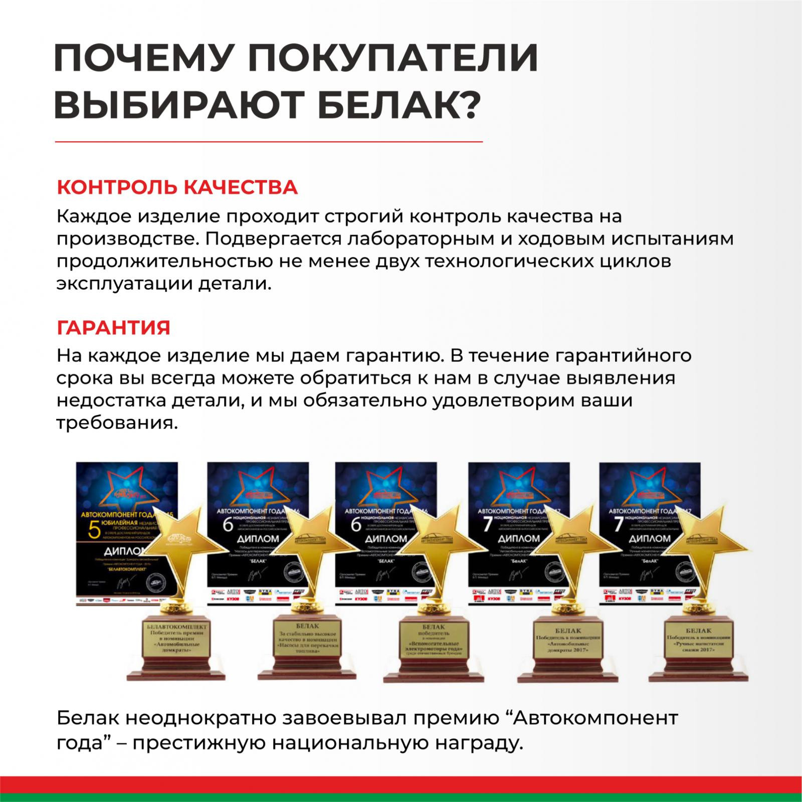 Домкрат БелАК 10 т БАК.00045 разработан российским производителем «БелАК», награждённым двумя национальными премиями «Автокомпонент года» и «Автоаксессуар года» за высокое качество и надежность выпускаемых домкратов. Продукция «БелАК» соответствуют нормам сертификации ISO9001 и ЕАС.