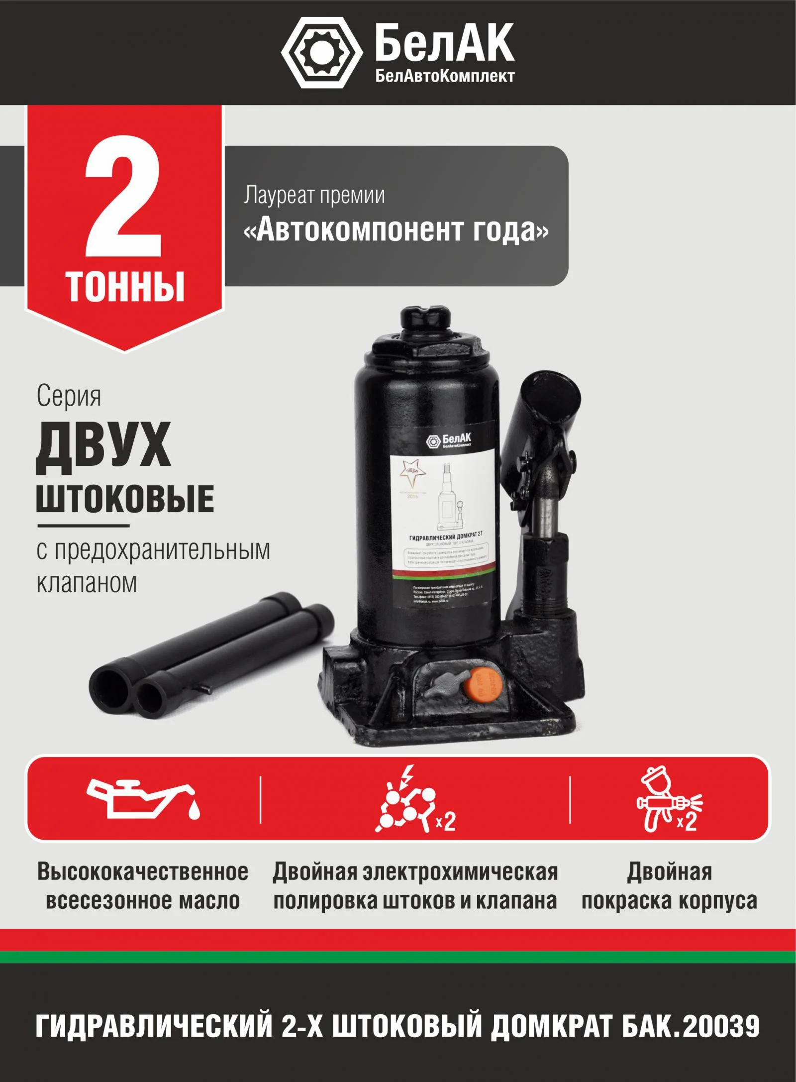 Домкрат гидравлический БелАК 2 т., двухштоковый