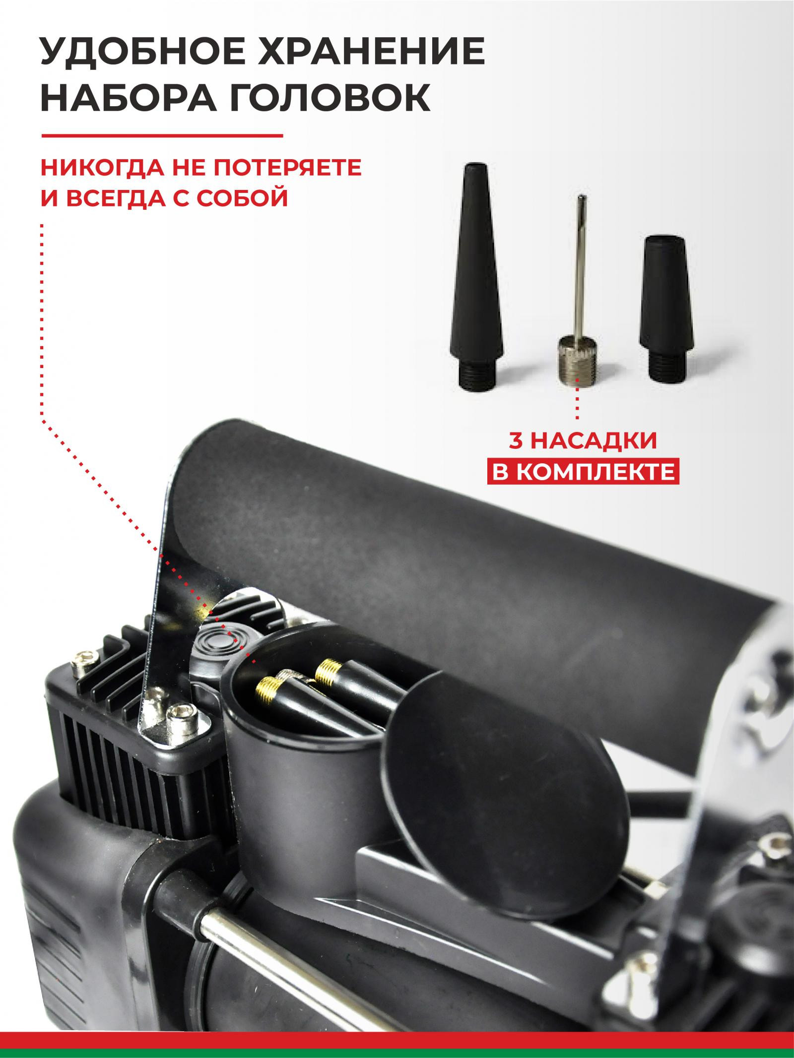 Мощность 200 Ватт — мотор с прямым приводом, что мощнее и надёжнее, чем моторы с зубчатой передачей. Компрессор работает практически бесшумно и без вибраций. При этом производительность устройства – 65 л/мин.