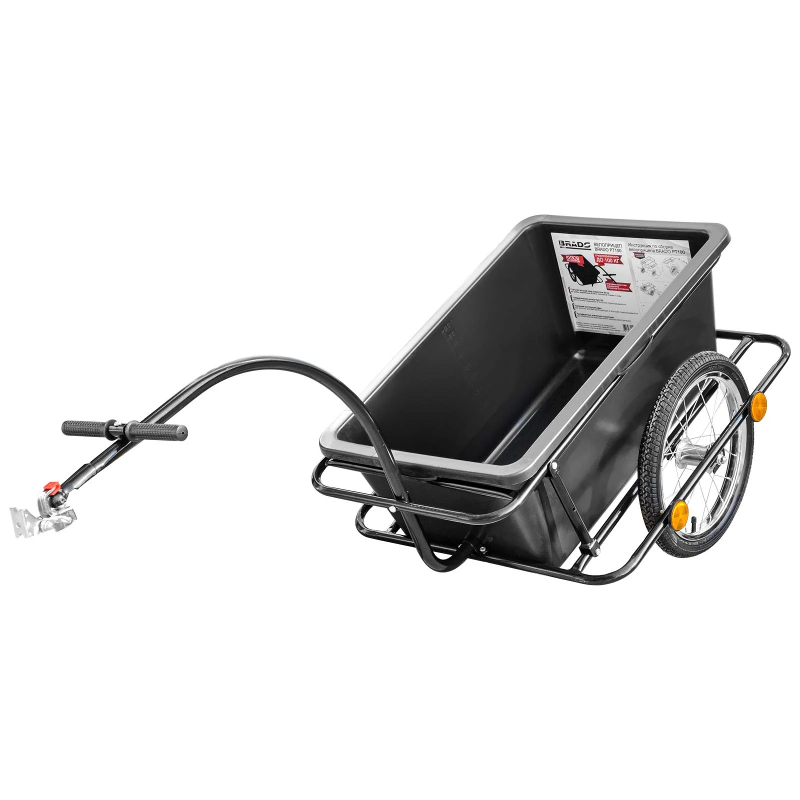 Велоприцеп Brado РT100 — это надежный и удобный способ перевозки вещей на велосипеде. Если вы ищете идеального компаньона для своих велосипедных поездок, то Brado РT100 — это лучший выбор для вас. Возможность снимать кузов делает его универсальным инструментом для перевозки грузов разных размеров и форм. Велосипедная сцепка включает в себя простую в использовании универсальную сцепку типа "фаркоп", которая крепится под сидение, чтобы обеспечить быстрое и легкое крепление и удаление (время закрепления велоприцепа к велосипеду займет не более 15 секунд). Разборная конструкция делает его легким и удобным для хранения и транспортировки, когда он не используется.