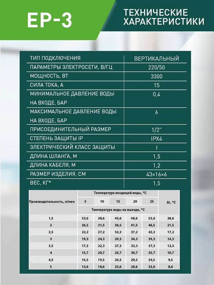 Мощный нагревательный элемент обеспечивает моментальный нагрев воды до 60°С, в зависимости от температуры входящей воды и напора. Небольшие габаритные размеры, совпадающие с обычными смесителями, позволяют легко установить электронагреватель в ванну. Благодаря душевой лейке, идущей в комплекте, можно принимать душ. Удобная регулировка температуры выходящей воды и цифровой дисплей, отображающий температуру воды, обеспечивают комфортное использование прибора. Конструкция излива предоставляет возможность его поворота на 360 градусов. Основные компоненты прибора, соприкасающиеся с водой, выполнены из нержавеющей стали.
